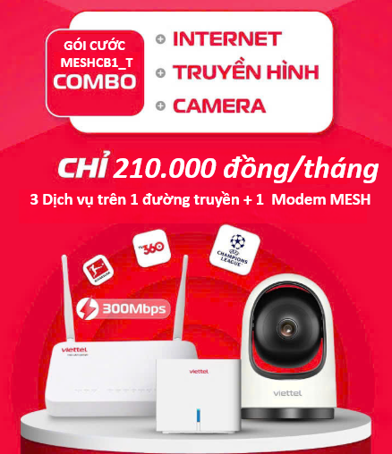 - Giá gói MESHCB1T chỉ 210.000đ/tháng, bao gồm modem Mesh hai băng tần và miễn phí trang bị truyền hình số và camera miễn phí khi khách hàng đăng ký gói cước. Đây là lựa chọn lý tưởng cho các gia đình, quán cà phê hoặc văn phòng cần mạng wifi Viettel mạnh và ổn định ở mọi ngóc ngách.